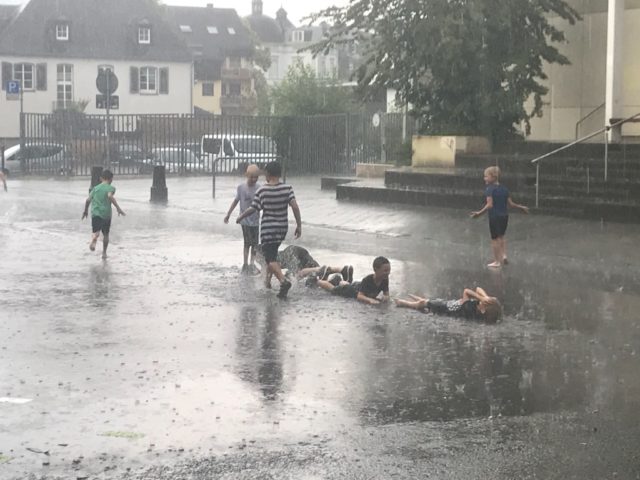Eigentlich lautet die Weisheit ja: Auf Regen folgt Sonne. Aber in Ausonius ist mal wieder alles anders! Nach einer „heißen“ und erfolgreichen Aufführung des diesjährigen Musicals in der BBS Aula folgte trotz aller Schlechtwetter-Vorhersagen ein strahlendes Fest auf dem Schulhof. Pünktlich mit dem Ende um 17 Uhr fing es an, wie aus Eimern zu regnen. Aber wer jetzt gedacht hat, „dann können wir ja Schluss machen“, der hat sich gewaltig getäuscht! Eltern, Kinder und Kollegium unserer Schule kamen erst so richtig in Fahrt. Allen voran die Kinder: Sie nutzten die Pfützen und herabfallenden Wassermassen zur ersehnten Abkühlung und hatten jede Mange Spaß! Die Erwachsenen zogen den überdachten Bereich vor und bei guter Musik und Getränken war die Stimmung einfach nur schön!