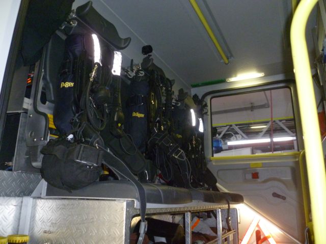 Als erstes sind wir in eine große Halle gegangen, in der drei Feuerwehrautos standen. Der Feuerwehrmann hat uns die Wagen und das Zubehör, das in den Wagen war genau gezeigt. Ein Bus ist extra für die Feuerwehr umgebaut worden. Es waren einige Sitze und zwei Liegen mit drei Sauerstoffflaschen zur Erstversorgung drin. In einem anderen Wagen lagen Pressluftflaschen und Atemschutzgeräte.