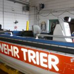 In der zweiten Halle standen drei andere Feuerwehrautos. Auf einem Anhänger lag ein schwarzes Schlauchboot für Einsätze im Wasser. Am Rand der Halle waren zwei Rutschstangen, damit die Feuerwehrleute bei einem Einsatz schnell bei den Fahrzeugen sind.