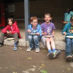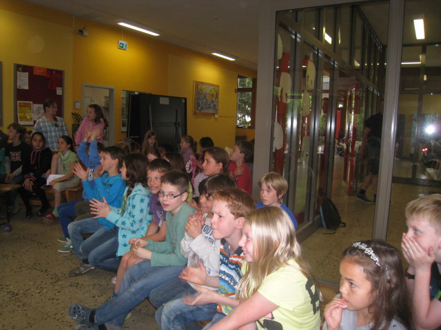Mit großen Schritten und Ausonius an ihrer Seite sind die Dritt- und Viertklässler am Chorwochenende ihrem Ziel der großen Musicalaufführung näher gekommen! Fleißig wurden am Freitag im Chor die verschiedenen Lieder geprobt, während einzelne Schauspieler mit großem Engagement ihren Text und ihren Auftritt übten, die Tanzgruppe noch an einzelnen Tanzschritten feilte oder sehr kreativ am Bühnenbild gebaut wurde. Am Samstag wurde es dann spannend: Zum ersten Mal wurde ein großer Durchlauf geprobt und Chor, Schauspieler und Tänzer zeigten gemeinsam ihr Können. Zwischendurch konnten sich alle mit leckerem Kuchen oder frisch gekochten Nudeln immer wieder stärken und bei schönem Wetter auf dem Schulhof ausruhen. Am Ende des Chorwochenendes waren dann viel Applaus und Jubelschreie Ausdruck der Begeisterung, die sich überall breit gemacht hatte, denn eins steht nun fest: Das extra für uns zur 50-Jahrfeier geschriebene Musical ist witzig, steckt voller Überraschungen und lässt uns zahlreiche Talente entdecken!