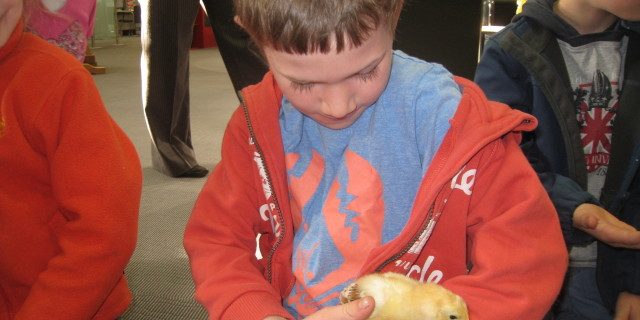 Küken hautnah konnten heute die ersten und zweiten Klassen bestaunen. Die Sparkasse hatte eingeladen und präsentierte ein ganz besonderes Erlebniss. Nicht das Geld stand im Mittelpunkt der Bank, sondern eine Voliere mit frisch geschlüpften Küken. Noch ganz erschöpft lagen die kleinen Flaumknäuel neben ihren Eiern und mussten noch von der Wärmelampe getrocknet werden. Nebenan flitzten die etwas älteren Hühnchen schon munter umher und die Kinder warteten gespannt, ob sie so ein süßes kleines Lebewesen auch streicheln dürften. Als dann der nette Hühnerzüchter kam, hatte er aber erst mal viele Fragen und Informationen und erst dann war es soweit und 2 kleine Küken wanderten von Hand zu Hand. Ganz schön aufregend für alle! Und zum Schluß wurde der beste Platz gefunden…ratet mal wo! 🙂