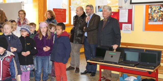 Am Donnerstag nach der Pause staunten die Kinder unserer Schule nicht schlecht, als sie im Foyer auf zwei Tischen 15 Laptops entdeckten. Die Provinzial-Versicherung hatte in ganz Rheinland-Pfalz über 1000 gebrauchte aber funktionstüchtige Laptops verschiedenen Schulen zukommen lassen. So kam es, dass Herr Udo Köhler (ehemaliges Mitglied Ortsbeirat Stadtmitte-Gartenfeld) und Herr Dominik Heinrich (Ortsvorsteher) den Geschäftsführer der Provinzial Trier Herrn Scheurer davon überzeugen konnten, dass die Spende der Ausonius Grundschule zu Gute kommt.